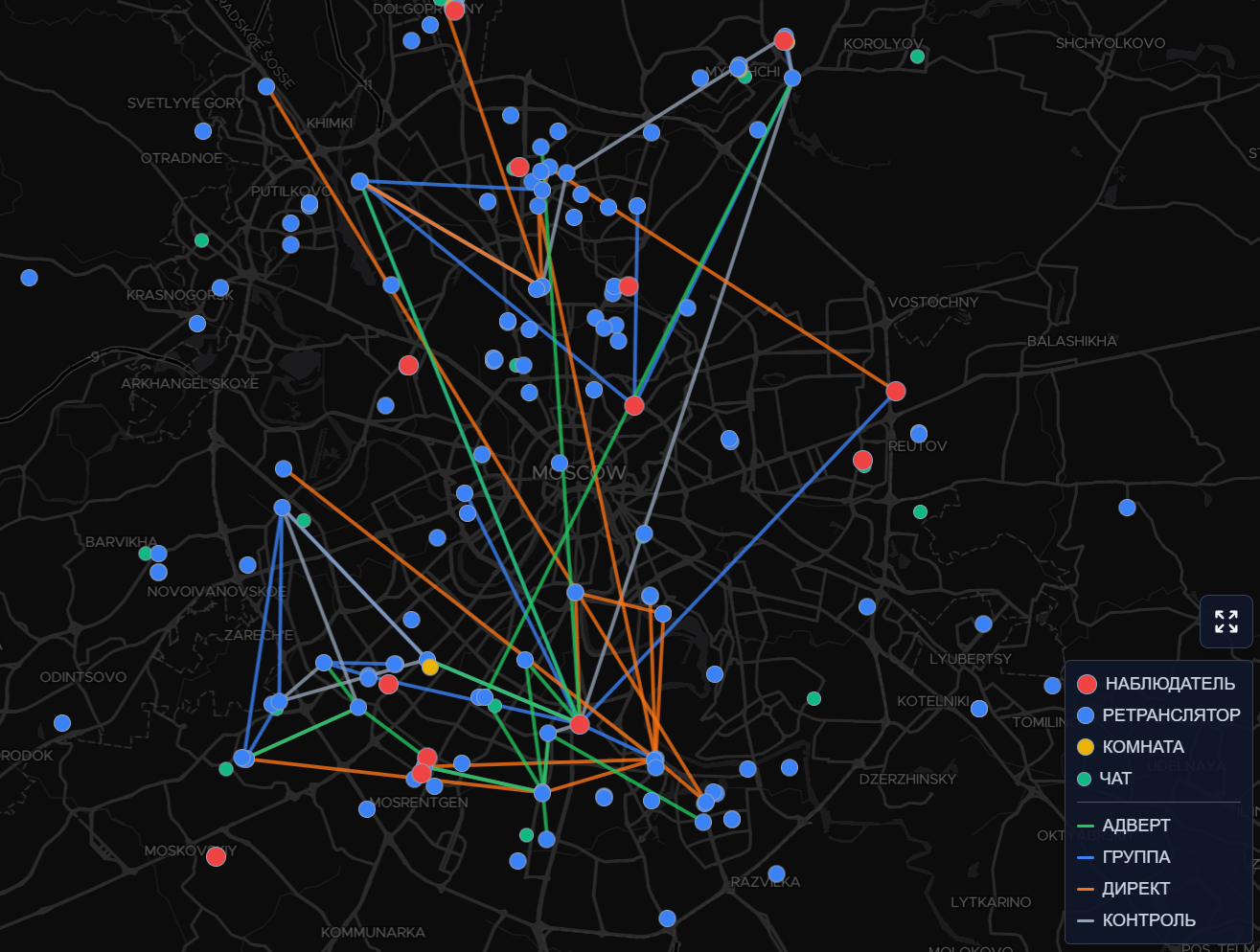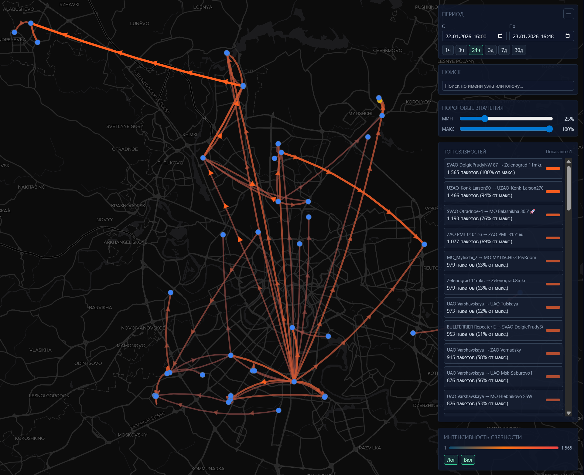 Мешкартель помогает понять, как сообщения распространяются по mesh-сети. Здесь можно анализировать пути распространения сигналов, изучать агрегированную связность и проваливаться в многоуровневую статистику.